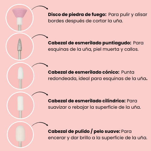 Funciona para uñas naturales y acrílicas. Trae diferentes puntas intercambiables que te permiten limar, pulir, dar forma y brillo sin dañar la uña. Es ideal tanto para retoques diarios como para un manicure completo en casa.